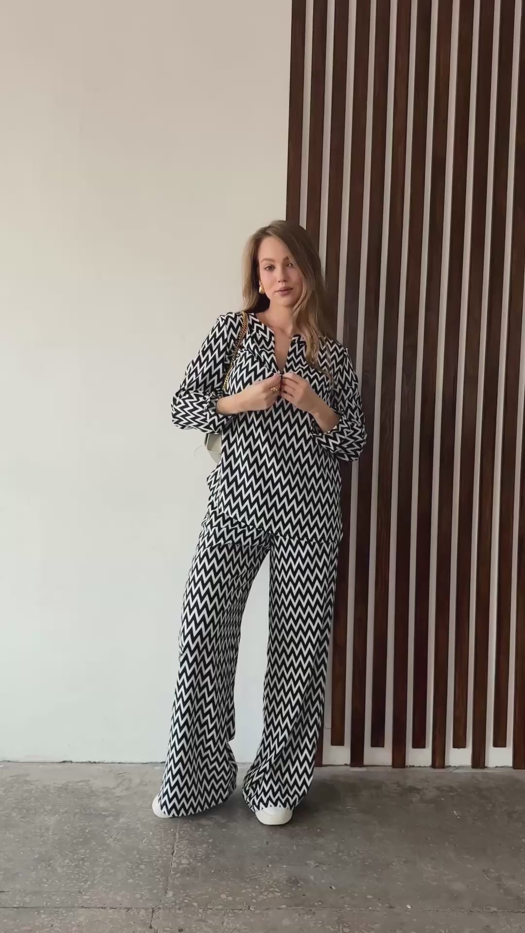 An elegant pantsuit for stylish women, including a straight-cut shirt with side slits and an original shaped neckline. Long sleeves emphasize the sophistication of the image, and loose trousers with an elasticated waistband and side pockets provide comfort and freedom of movement. An ideal choice for office looks or casual outings. Comfort, style and modern design - all in one set.