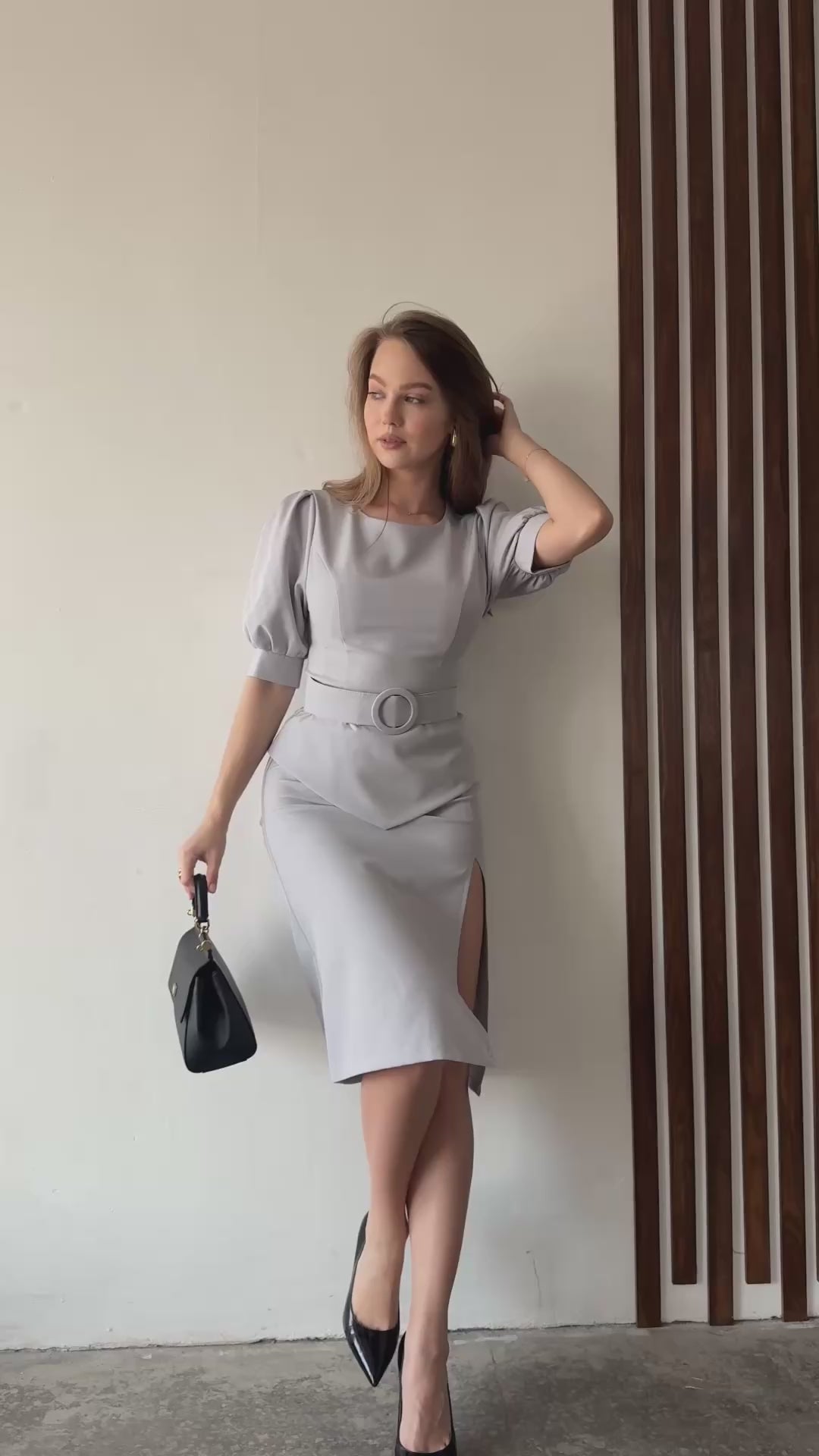 Elegant two-piece suit: top and skirt. The top with short puffy sleeves on cuffs and a shaped bottom adds sophistication to the image. The below-the-knee skirt with a side slit emphasizes femininity and makes the step light. The perfect choice for stylish looks for special occasions and everyday elegance.