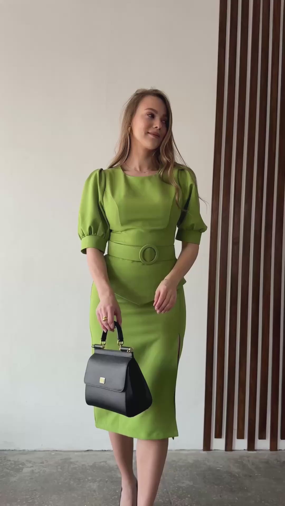 Elegant two-piece suit: top and skirt. The top with short puffy sleeves on cuffs and a shaped bottom adds sophistication to the image. The below-the-knee skirt with a side slit emphasizes femininity and makes the step light. The perfect choice for stylish looks for special occasions and everyday elegance.