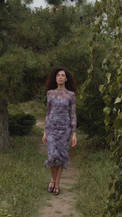 Fitted dress made of printed mesh with lining, with decorative gathers on the front. The elegant silhouette and original design create a sophisticated look, emphasizing femininity.