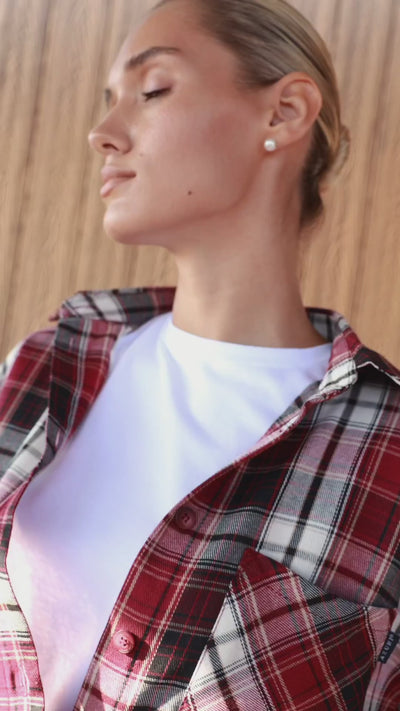 An elongated oversized shirt with a stand-up collar and long sleeves with cuffs. A patch pocket and dropped shoulder line create a fashionable and comfortable look. Ideal for stylish and comfortable everyday use.