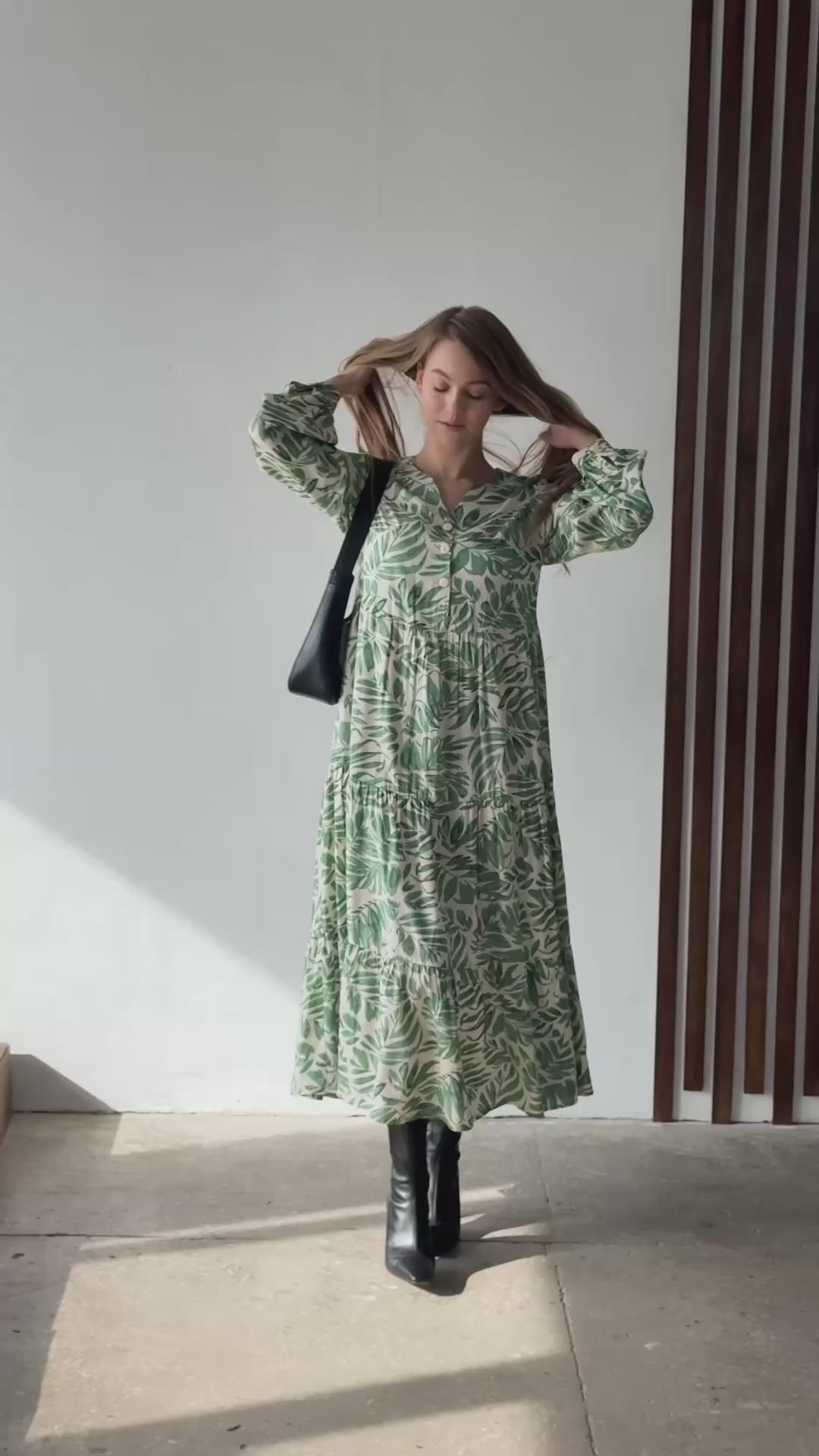 An elegant maxi dress with airy frills will highlight your femininity and create a light romantic image. The shaped neckline adds sophistication, and the voluminous sleeves with cuffs give the silhouette expressiveness. The button closure provides a comfortable fit and makes the model universal for both everyday and special occasions.