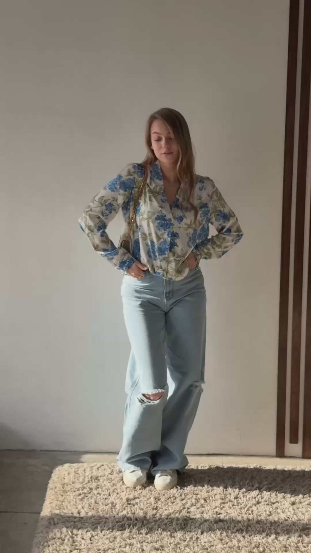 An elegant loose shirt with a one-piece stand-up collar is an ideal choice for stylish looks. The set-in sleeve with soft folds from the shoulder seam adds lightness and volume, and the buttoned cuffs add sophistication. The fabric composition ensures comfort at any time of year. It goes well with trousers, skirts and jeans.